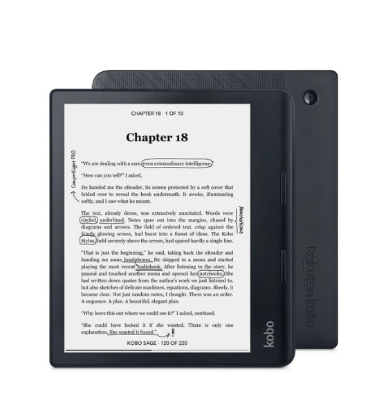 The Kobo Sage is an advanced 8-inch e-reader designed for a premium reading and note-taking experience, featuring a sharp 300 PPI E Ink Carta 1200 display with fast page turns, Dark Mode, and ComfortLight PRO for adjustable brightness and reduced eye strain. Built with 32GB of storage, a powerful quad-core processor, Bluetooth for audiobooks, and waterproof durability, it also includes physical page-turn buttons for added convenience. Compatible with the Kobo Stylus, it allows users to handwrite notes and annotate directly on eBooks and PDFs, with options to convert handwriting to text and sync via Dropbox—making it a versatile choice for both leisure reading and productivity.